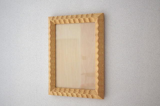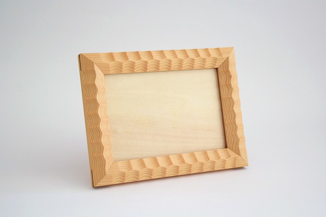 小さな波々が特徴のフォトフレームです。 無垢材の魅力の詰まった一品です。 こちらはホワイトオークです。 【サイズ】 外形寸法:幅170 × 高さ130 × 奥行き25 (mm) 【材種】 ホワイトオーク 【仕上げ】 オイル ブラックチェリーはこちら→https://akiyaseisaku.base.shop/items/111407784