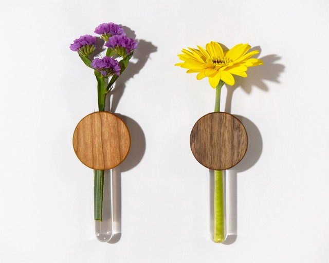 壁に飾って楽しむ一輪挿しです。 裏にマグネットが仕込んであるので、画鋲2つで手軽に飾ることができます。 円柱ではなくドアノブのような形をしているため、持ちやすく見た目もスッキリして見えます。 花瓶が置けないような場所も、ほんのり彩りを添えてくれます。 【材種】 ※必ず材種をお選び頂いてから、ご購入にお進みください。 ブラックチェリー ブラックウォールナット ホワイトオーク ハードメープル ビーチ スギ 【仕上げ】 オイル塗装 【サイズ】 〔木部〕径 46mm × 厚さ 25mm 〔試験管〕外径15mm × 長さ 105mm ◾️WallVase(木部)1つ、試験管1本、画鋲2つが1セットです。 ◾️画像と実物では色味や木目が異なることがございます。 ◾️ブラックチェリーは焼けやすい材質のため、時間が経つにつれて赤黒く変化していきます。 ◾️強力なマグネットを使用していますが、安全に考慮して一輪での使用をお勧めします。 ◾️写真の花は商品に含まれていません。 以上の点を予めご了承ください。