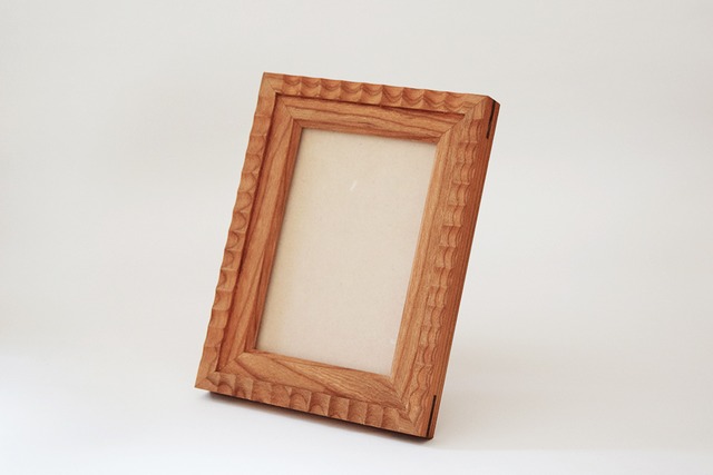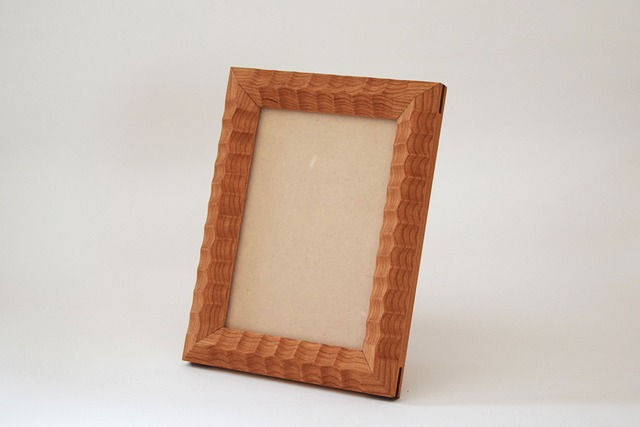 小さな波々が特徴のフォトフレームです。 無垢材の魅力の詰まった一品です。 こちらはブラックチェリーです。 【サイズ】 外形寸法:幅170 × 高さ130 × 奥行き25 (mm) 【材種】 ブラックチェリー 【仕上げ】 オイル ホワイトオークはこちら→https://akiyaseisaku.base.shop/items/111496294